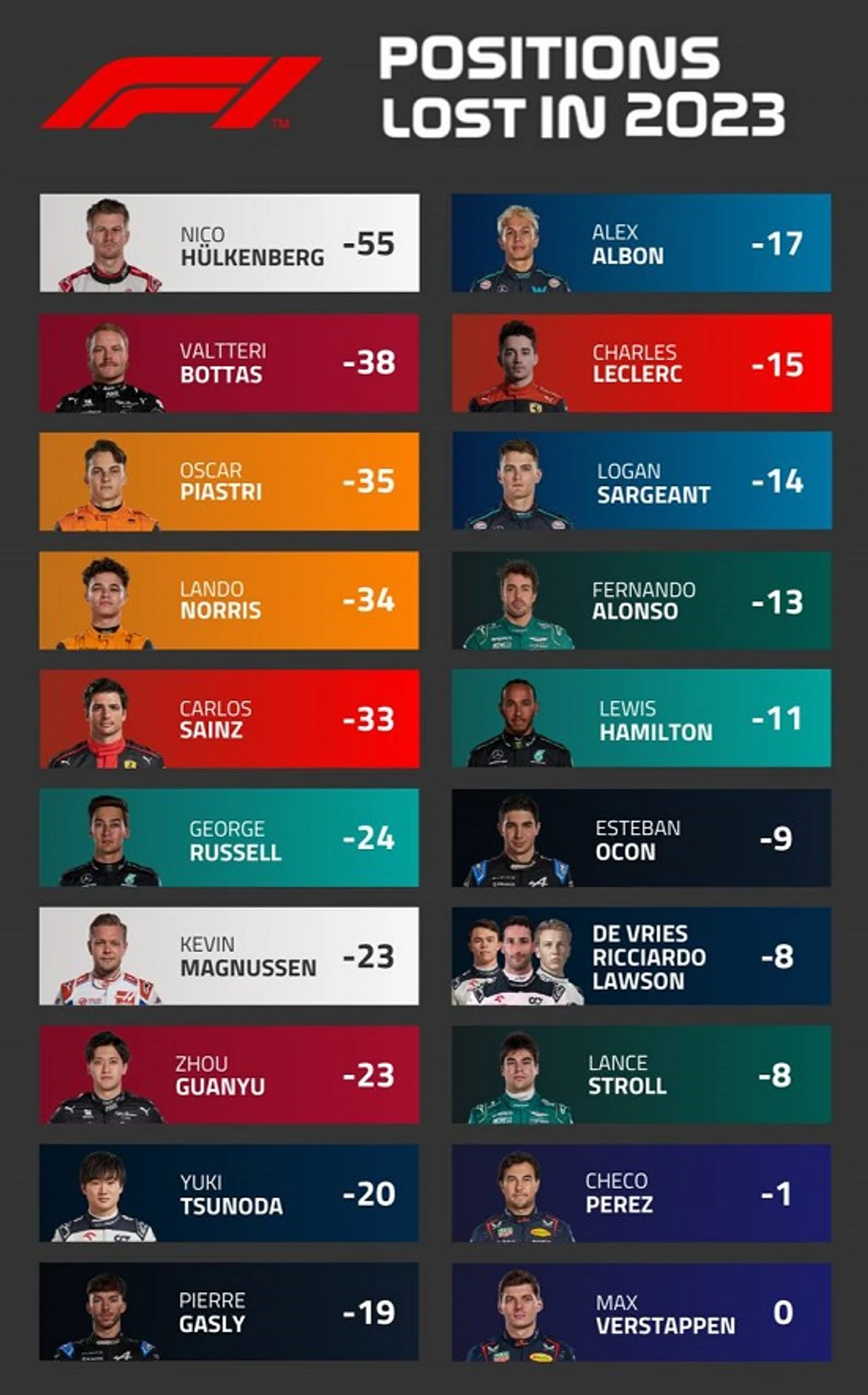 Разбираемся, сколько позиций пилоты выиграли/потеряли по сравнению со своим стартовым местом в сезоне-2023.