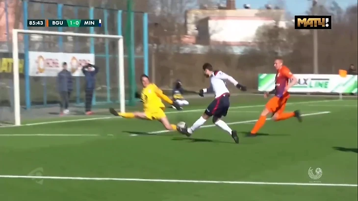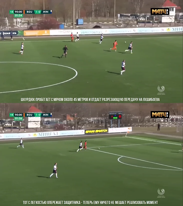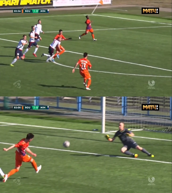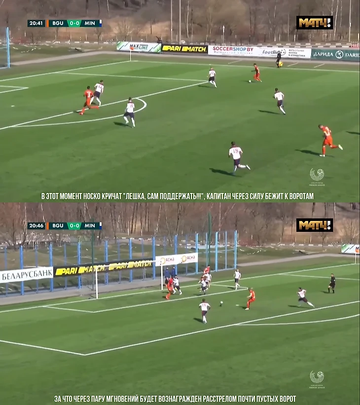 Так вышло в атаке на двадцатой минуте. Капитан Носко получил мяч в центре, дальше отправив диагональ на Яхшибоева, а сам решил сделать паузу и не бежать в штрафную. «Лешка, сам поддержать!!!» - кричат ему со скамейки. В это время узбекский игрок без каких-то проблем (потому что гений) продвинулся в штрафную и пробил с острого угла – мяч был отбит в центр штрафной в свободную зону. Куда по реву тренеров уже прибежал Лешка и расстрелял ворота «Минска» - 1:0.