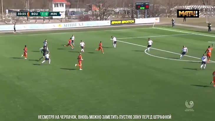 А вот хозяева раз за разом успешно проводят контратаки. Проблема «Минска» весь матч заключается в том, что их центральные полузащитники слишком часто оттягиваются в зону владения мячом, которое у гостей обычно происходит на флангах. Поэтому центр оголяется максимально удобным образом.