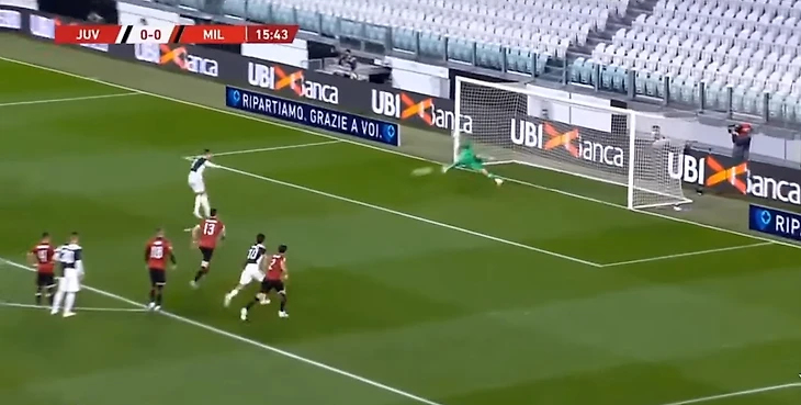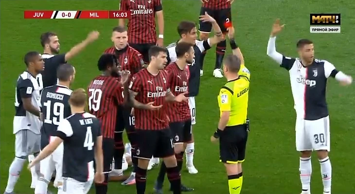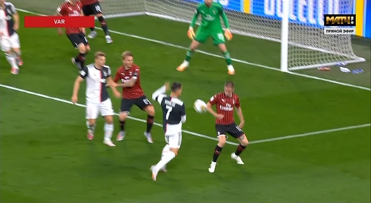«Милан» был плотно прижат к собственной штрафной. Настолько плотно, что владение мячом «Юве» приближалось к отметке 90%. От такого «красно-черные» начали грубо фолить неподалеку от штрафной. Так, опасный свободный бил Дибала. Пошли угловые, один из которых закончился непонятно как прошедшим соперника на углу вратарской Криштиану – португалец принял мяч грудью, прокинул его и пробил в дальний угол, но мяч разминулся со штангой. Оказалось, он сыграл еще и рукой. Обычный момент, ничего особенного. Я вот тоже не обратил внимания ни на что далее, как тут судье подсказали в наушник, что там было еще кое-что. Вот это.