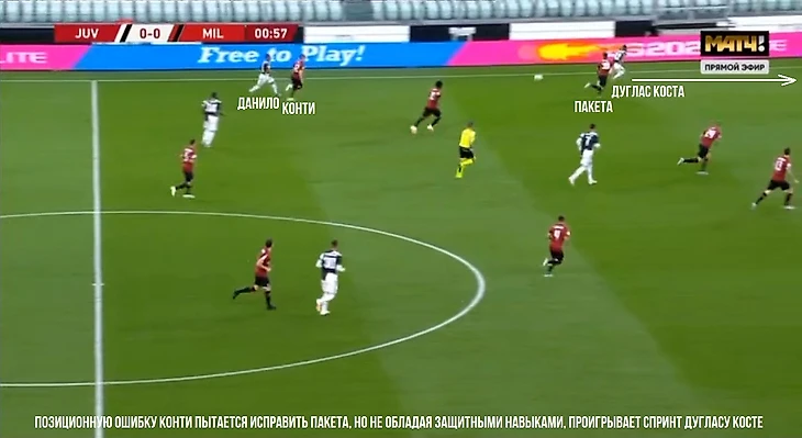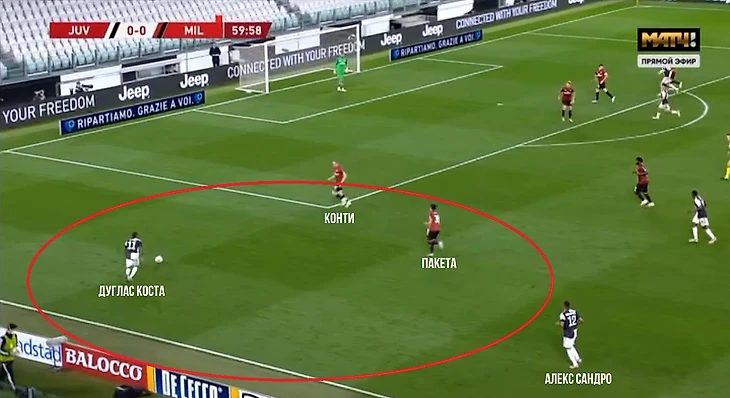 «Ювентус» мгновенно понесся в атаку, чуть не забив на первой минуте. Фланг убежавшего куда-то вперед Конти был моментально продавлен, после чего туринцы прошлись по нему вплоть до вратарской, где уже пас назад застал на углу штрафной свободного Дугласа Косту, а тот пробил мимо. К Конти будут еще претензии.