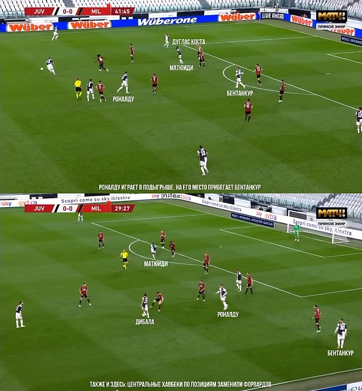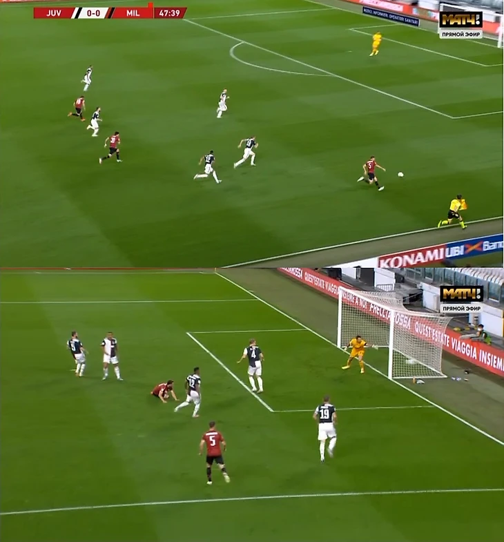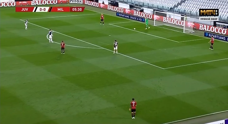 Конечно, можно сказать, что «Ювентус» доминировал всю игру, но опасней всего выглядел прессинг до 15-й минуты, когда «Милан» не то что не мог выйти со своей половины – у «россонери» раз за разом отбирали мяч на их же половине, а затем, когда атака «Юве» не заканчивалась ничем, то Доннарумма выбивал мяч к центру поля, где хозяева его забирали обратно. И так было вновь и вновь. Этот период сильно напомнил игру Англии и Португалии на ЧМ-2006, где вратарь Рикарду только и делал, что бил к центру поля каждые 2-3 минуты, а Криштиану Роналду даже за мяч толком зацепиться не мог. Спустя 14 лет он в игре с «Миланом» уже сам устроил дестрой хоть в какой-то структуре игре гостей, так как тройка форвардов не выпускала мяч из штрафной.