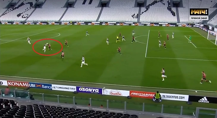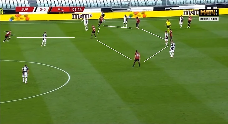 «Милан» в обороне до 15-й минуты – это 4-4-1-1, Пакета и Чалханоглу опускаются до уровня опорных полузащитников, а в прессинге участвуют лишь Ребич и Бонавентура. «Россонери» совершенно не стремятся бежать высоко в прессинг, встречая плотно лишь на уровне финальной трети, и еще плотнее (наподобие организованной, но кучи) – у штрафной. Весь матч линия полузащиты держалась стройно, изредка выдергивался Кессиэ на мяч, после чего быстро возвращался обратно. С Роналду так вообще играли вдвоем – каждый контролировал, как бы это странно не звучало, ноги Криштиану, а точнее, их действия, ведь он может сделать что угодно. Так как «Милан» едва ли не раз-другой за эти 15 минут пытался хотя бы перейти центральный круг, то сложно сказать, какова была задумка Пиоли касаемо игры в атаке. Наверное, так и было 4-2-3-1, но сейчас уже и не скажешь.