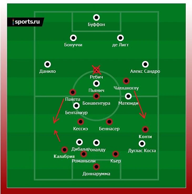 Выбор Данило вместо Куадрадо логичен тем, что колумбиец заигрывался впереди в первом матче, что нередко приводило к интересным атакам миланцев. Да и в целом если его ставит Сарри в защиту, то в тех играх, где соперник считается заведомо слабее. Пьянич не прогнозировался никем в качестве игрока основы (скорее ставили Хедиру), так как говорили, что он не готов – но кому еще подменять Рэмси? Остальные игроки «Юве» предсказывались. «Милан» решает сыграть 4-2-3-1, где Ребич вовсе не играет ложную «девятку», а вполне себе центрфорварда. К тому же, Чалханоглу и Пакета играют ближе к флангам, а поддерживать атаки на позиции реджисты выходит Бонавентура. И выход Конти справа в защите от безвыходности, хотя у Пиоли есть еще Лаксальт, но с тем, похоже, вообще не считаются в команде.
