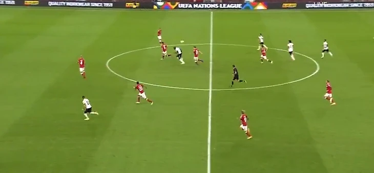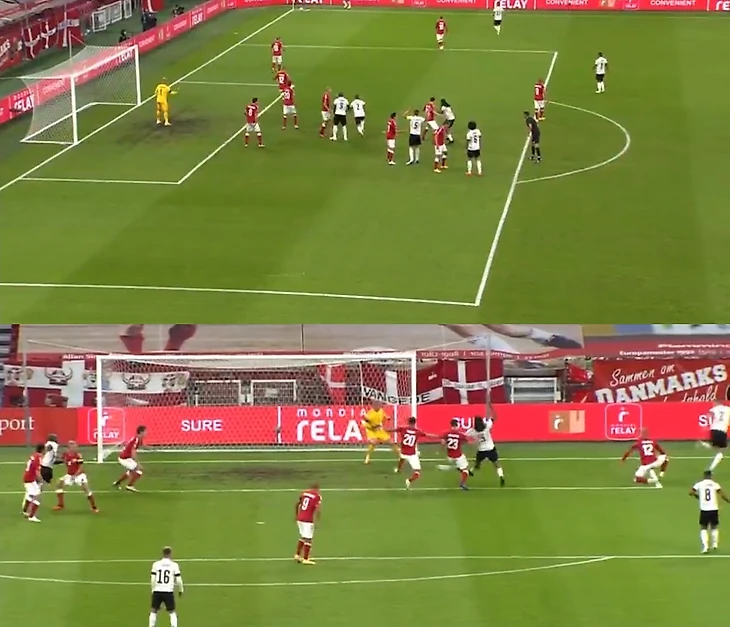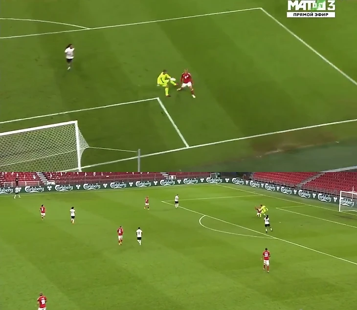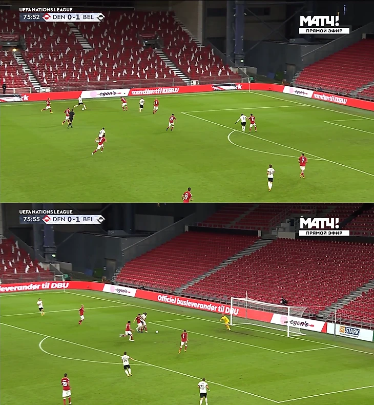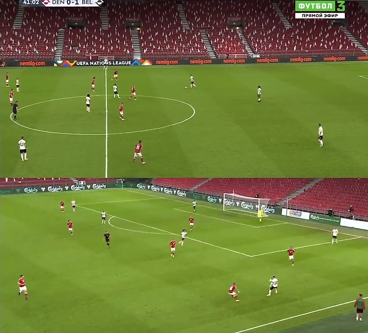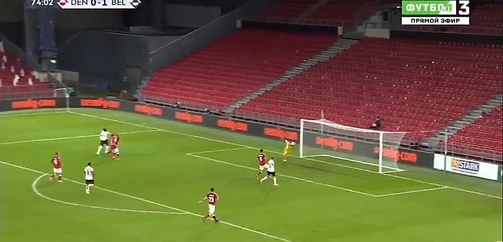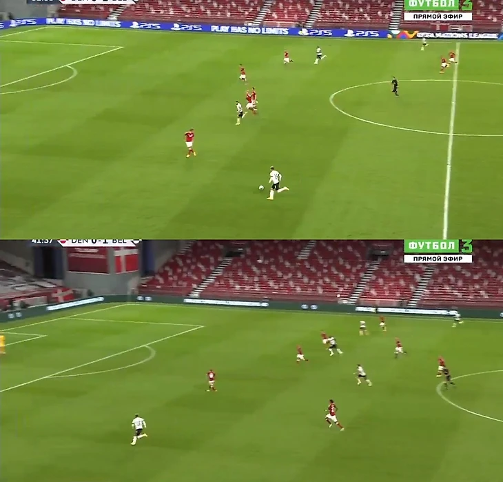 Команда Мартинеса старалась выходить либо этими средними передачами на латералей, либо напрямую забросом на Лукаку и форвардов. И вот она проблема датчан – заигрывающиеся впереди Васс и Поульсен оставляли свободную бровку Феррейре Карраско. Да, это удивительно, но Юссуф даже чаще был ближе к Яннику, весь матч будучи полезней Васса в защите. Это была какая-то особая установка, притом что бельгиец разыгрался лишь к собственной замене. Но несколько качественных отправок мяча вперед со своей половины – и заигрывающиеся датчане видят за своей спиной убегающего вингера «Атлетико». Именно с этого началась результативная трехминутка гостей. И этот скрин – не единственный, где перед Карраско есть свободная зона.