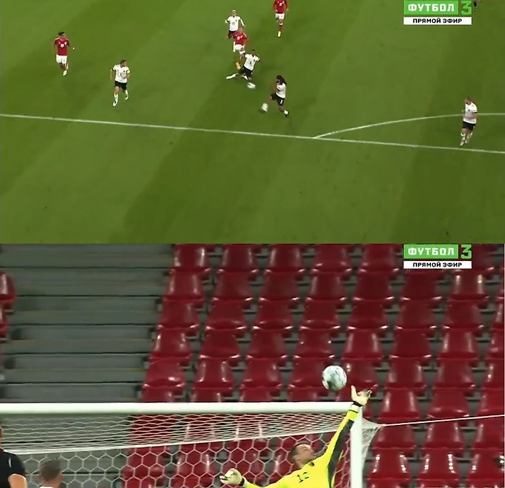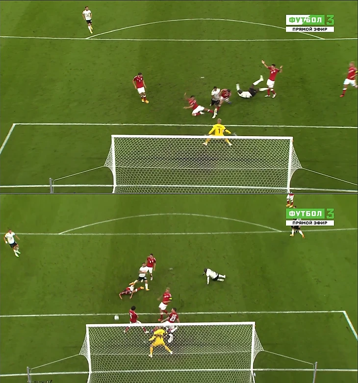 Давайте уже к моментам. Собственно, заигравшись там на левом фланге атаки, был заработан штрафной, который сам же решил Янник и пробить. Попал в перекладину – а ведь Шмейхель коснулся мяча кончиками пальцев.