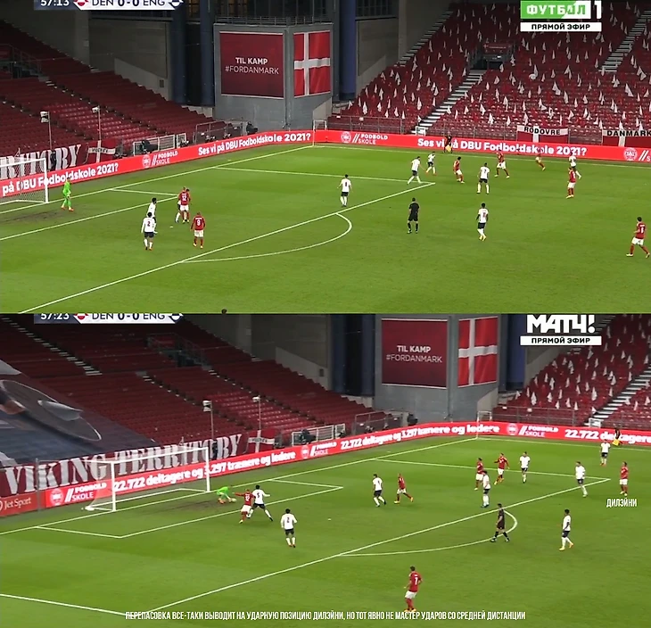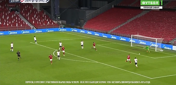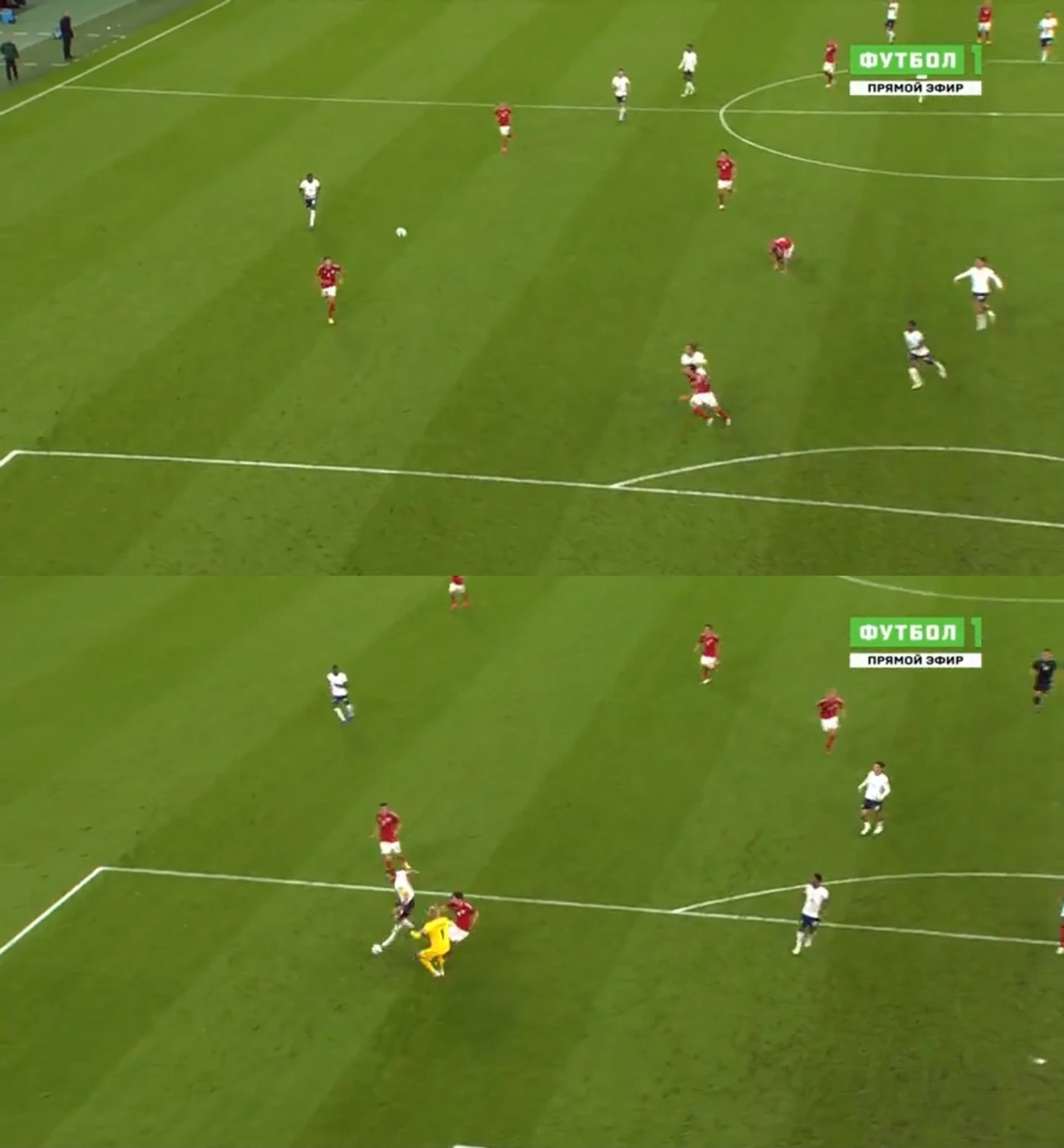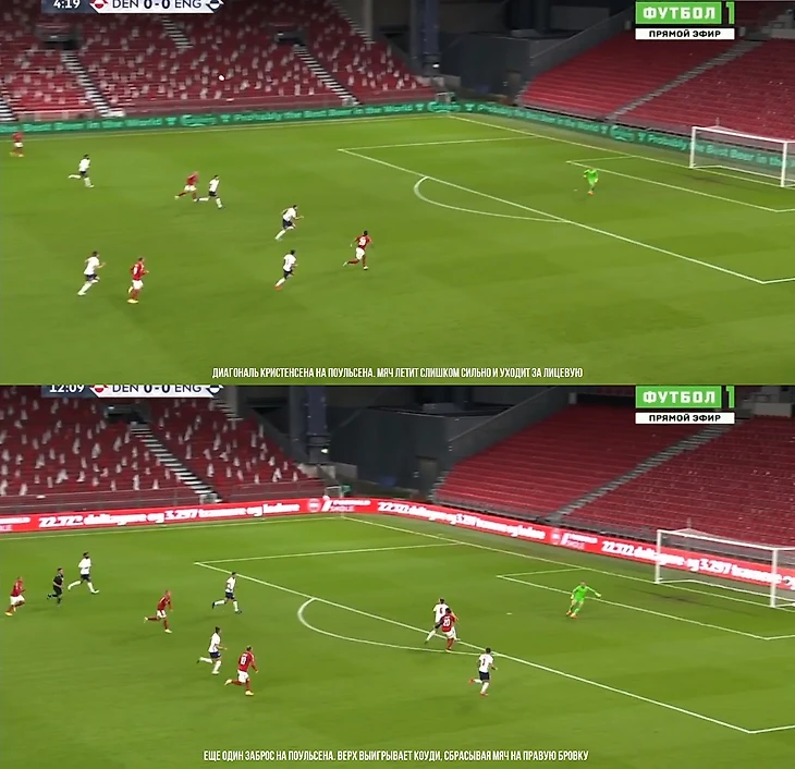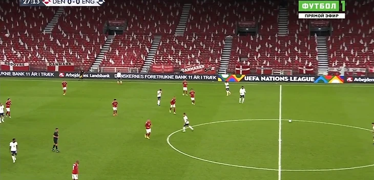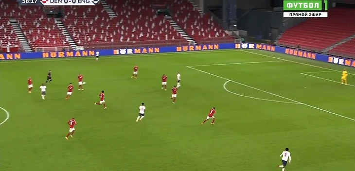 Также англичане первое время много катали мяч у своей штрафной. Если это длилось долго, то датчане включали прессинг, чем пугали Пикфорда, который совершал брак, вынося мяч вперед. Затем это прекратилось вместе с более быстрым выходом от своей штрафной – одновременно с этим прекращался и высокий прессинг хозяев. Опять же параллель со сборной России, которая бросается высоко, если мешкает соперник.