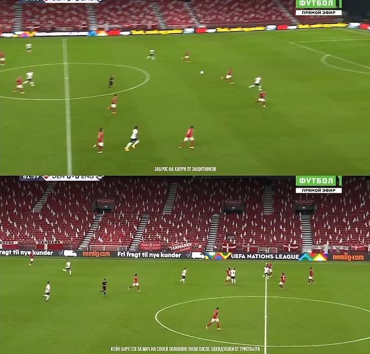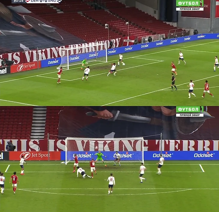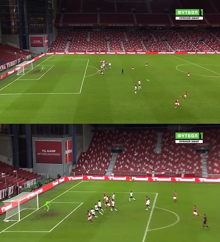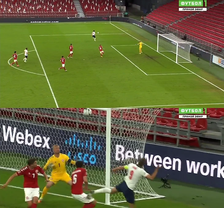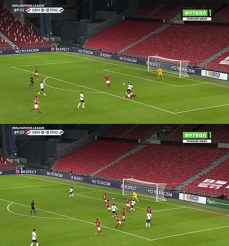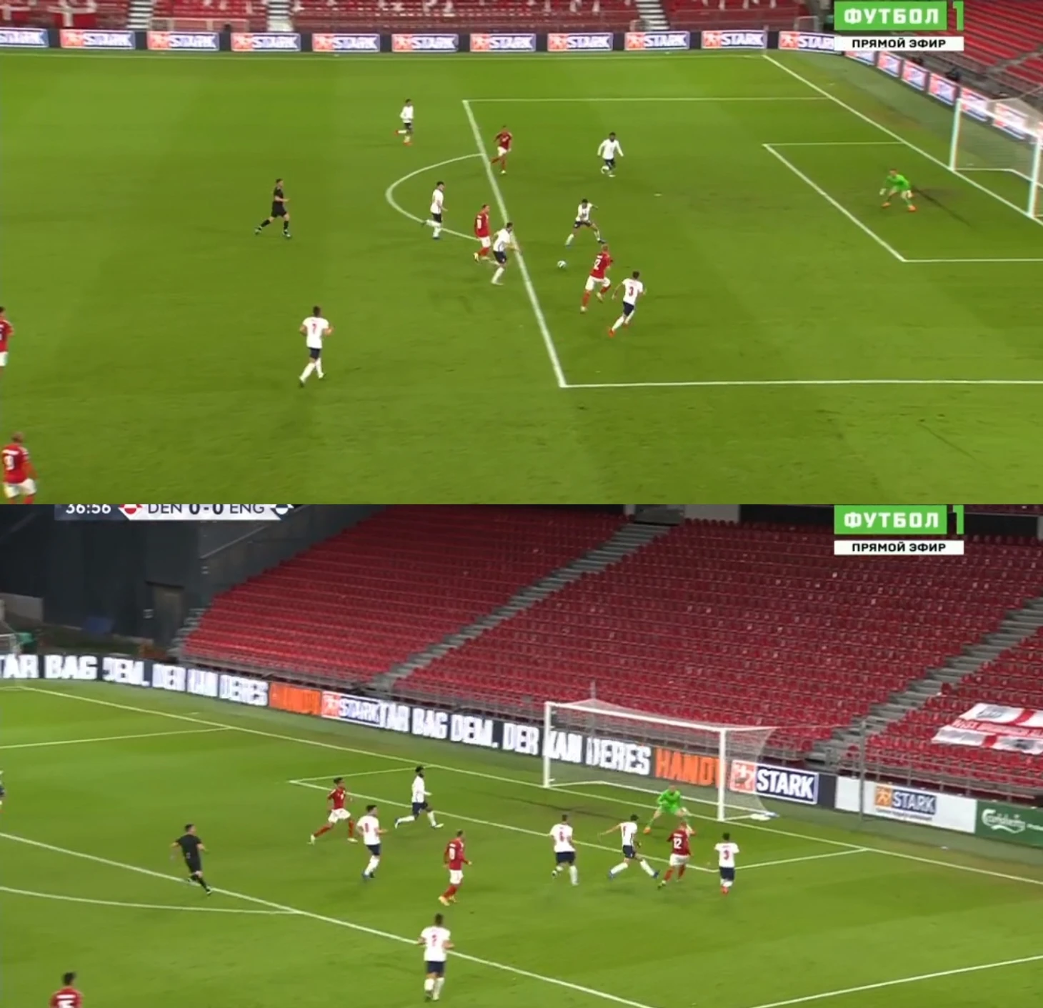 Также англичане первое время много катали мяч у своей штрафной. Если это длилось долго, то датчане включали прессинг, чем пугали Пикфорда, который совершал брак, вынося мяч вперед. Затем это прекратилось вместе с более быстрым выходом от своей штрафной – одновременно с этим прекращался и высокий прессинг хозяев. Опять же параллель со сборной России, которая бросается высоко, если мешкает соперник.