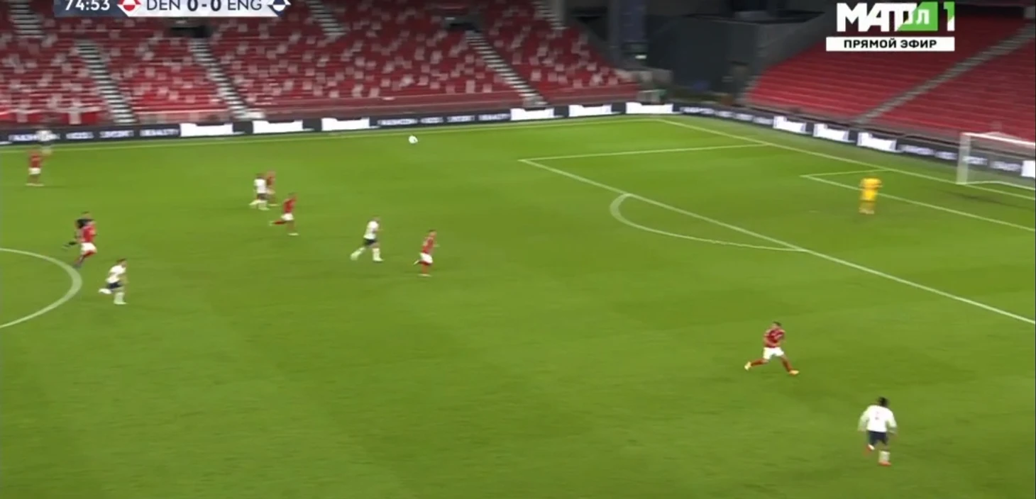 Игра была в целом равной. Несмотря на больший процент владения мячом (54% на 46%), англичане больше возились на своей половине, чтобы подготовить диагональ, тогда как датчане не совсем всегда старались делать свои длинные передачи на правый фланг (скорей всего из-за смены игроков – Брэйтуэйт не такой высокий, а правше Кристенсену неудобно отдавать налево), а циркулировали без толку в районе финальной трети поля. Моментов было немного, уж в первом тайме точно. Бил штрафной метров с тридцати Сков, но сильно выше. Прошел один из прострелов справа на Поульсена, но тот не обработал мяч. Бил дважды издали Брэйтуэйт – тоже так себе. Реально классный момент был на 36-й минуте, когда проснулся Эриксен.