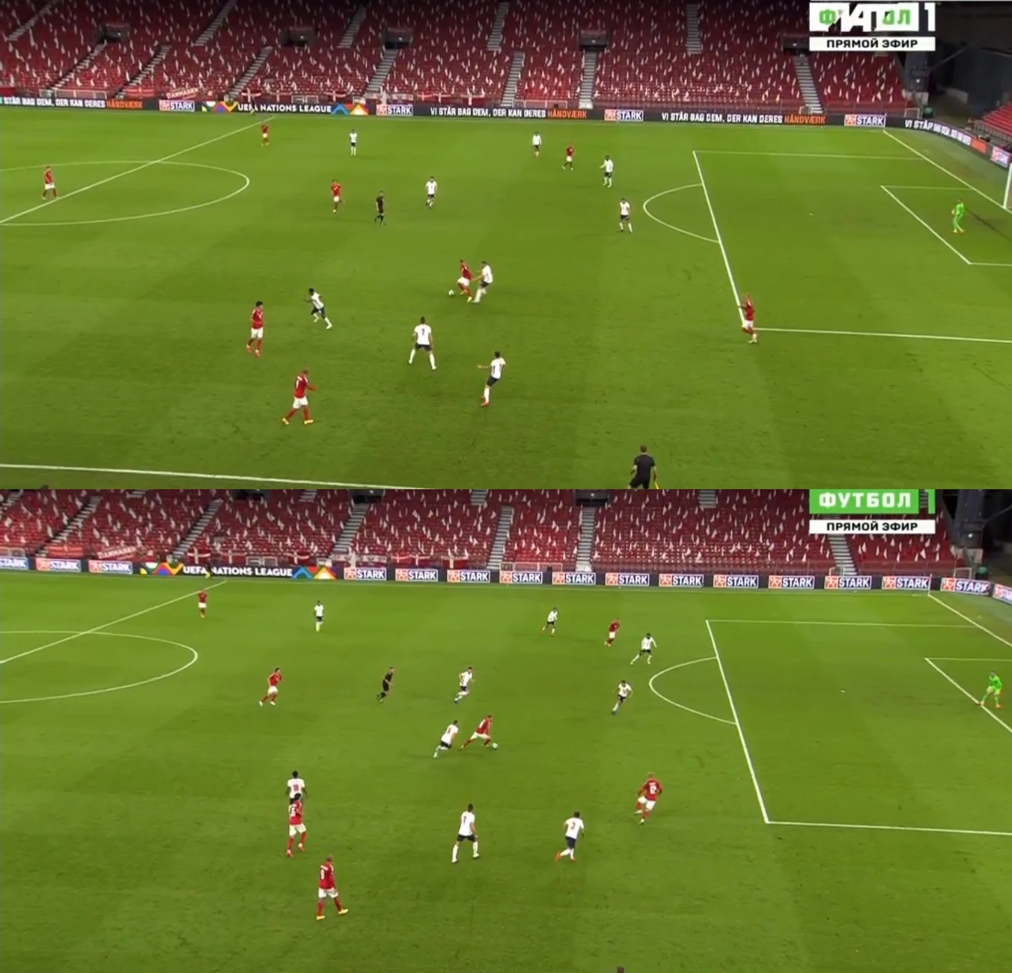 Вот этого «что» датчанам не хватает. Думаю, что это во многом связано с формой Кристиана Эриксена. В этот раз он сыграл получше, чем с бельгийцами, он сделал буквально пару интересных решений, одно из которых мне очень понравилось, но об этом ниже. Потому что сейчас у датчан не налажен последний пас – они в целом неплохо выступили в защите, активно комбинируют в середине поля, но нет взаимосвязи с самой передней линией. И вот когда Эриксен вновь выйдет на пик своих возможностей, тогда стоит ожидать опасностей. Пока их нет, и это удручает. Удручает датчан конечно – нас это должно только воодушевлять.