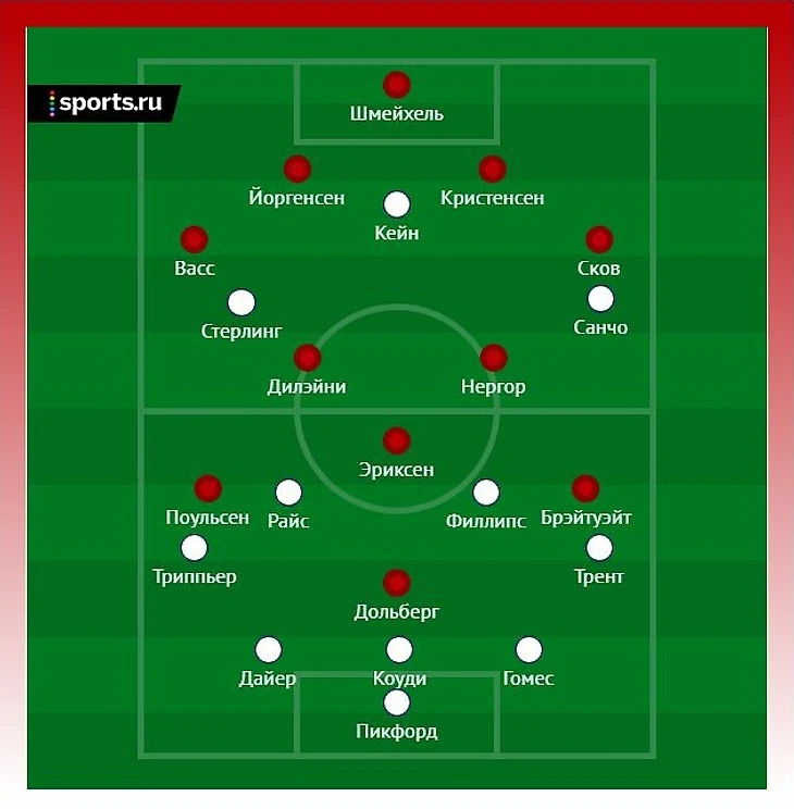 Да, изменится. Но это скорее косметические изменения. В пару к Кристенсену на этот раз вышел Занка – Матиас Йоргенсен из «Фенербахче», чей последний сезон не то чтобы и удался, судя по весенней аренде в немецкую «Фортуну» (вылетели из Бундеслиги). Вместо Хейбьерга в центре поля еще один представитель Туманного Альбиона – Нергор из «Брентфорда», но Пьер-Эмиль все же больше в сторону розыгрыша мяча, тогда как Кристиан играет опорника. Не убрал Юлманд из основы Дольберга, что по матчу с бельгийцами было дело решенным. Но сегодня у него будет шанс, так как в центре защиты англичан выходит дебютант.