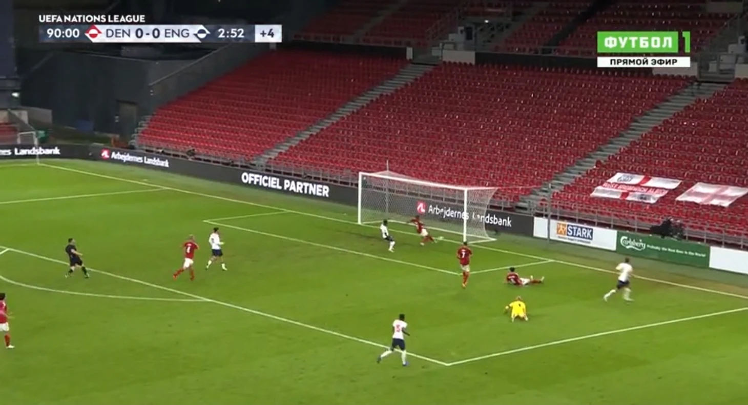 Датчане меняют Брэйтуэйта – матч для него вышел так себе. Выходит Кьер, на правый фланг уходят Васс и Занка. 89-я минута. Тут уже вышел и вместо Трента еще один дебютант Мэйтленд-Найлз из «Арсенала», на которого тоже стали грузить справа. В одной из атак он доходит до штрафной, но храбрые датчане (Сков точно) ложатся костьми под его попытки остановить мяч. Тот отскакивает к находящемуся позади Кейну – и тот бьет или простреливает рядом с воротами. Ого, это что – концовочка?!