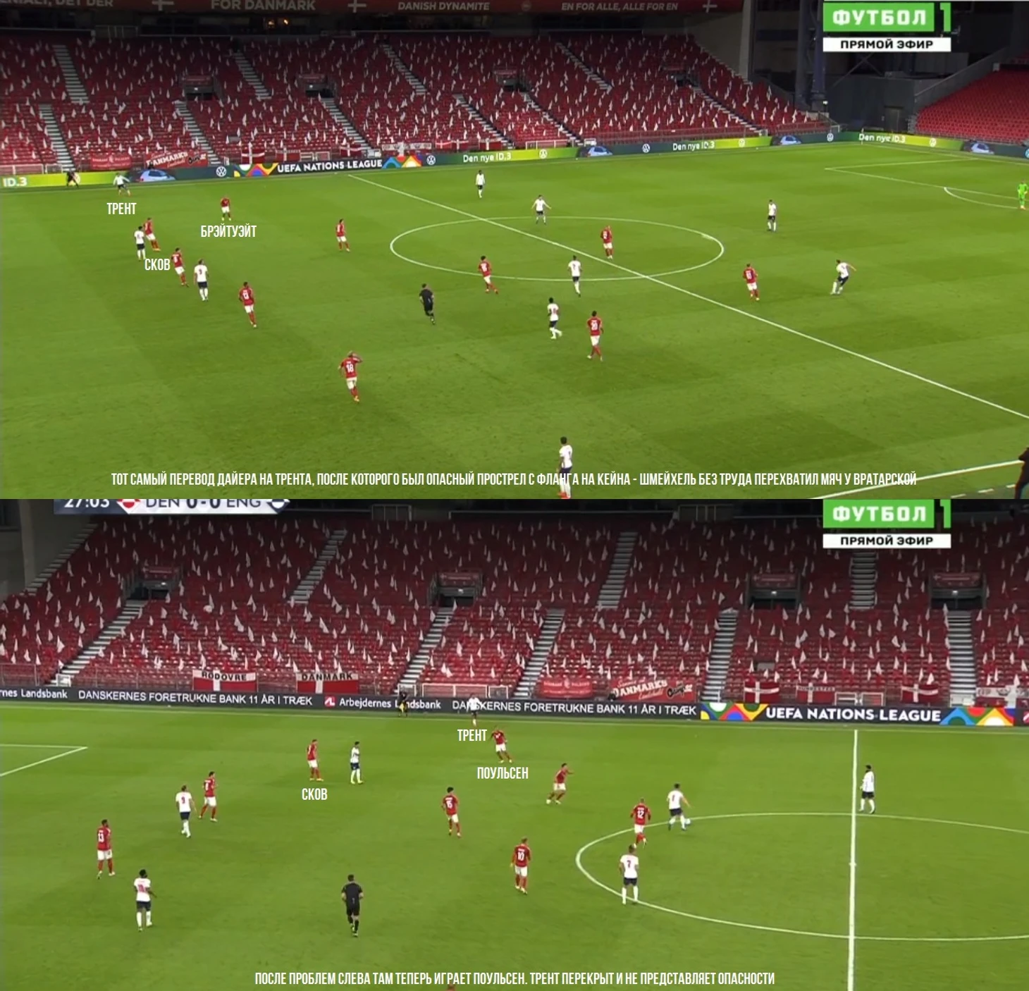 Однако стоит сказать, что несколько не самых приятных моментов для левого защитника Скова там все же состоялось. Несколько раз за первые 15 минут он либо Брйэтуэйт оставляли Трента одного, так как защитник датчан пытался еще следить за Санчо, который намеренно отходил в центр. Трент пару раз накручивал соперников, один раз даже опасно прострелил. После этого Юлманд решил поменять флангами Поульсена и Брэйтуэйта, чтобы Юссуф, который весьма неплохо обладает защитными навыками, плотнее сдерживал Трента. Англичане продолжали на него грузить, но опасность исчезла. Ближе к концу тайма Юлманд вновь перемахнул фланги. Реальной опасности в дальнейшем после этих диагоналей Александер-Арнолд больше не представлял.