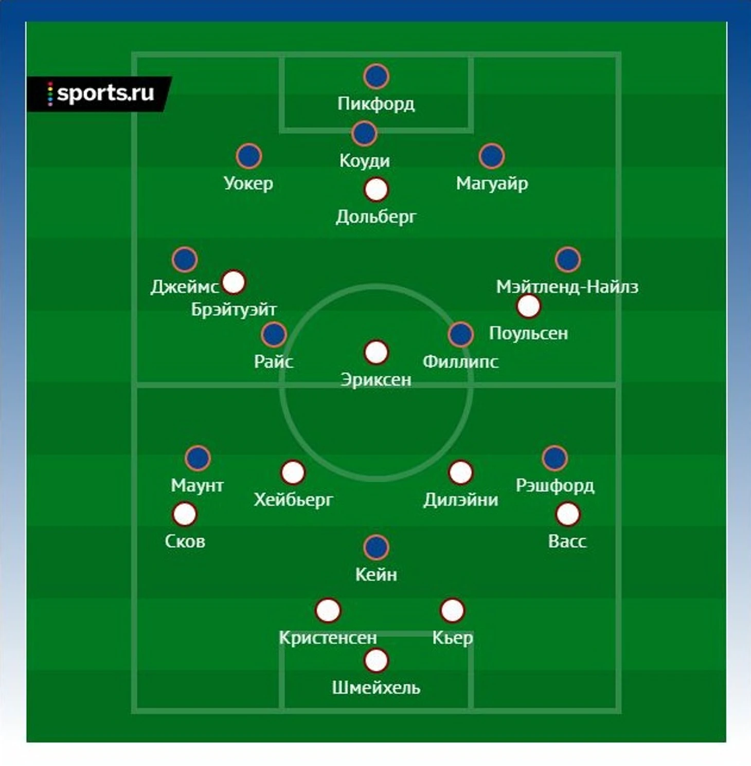 Дания выходит абсолютно тем же составом, что и с исландцами. Классические 4-2-3-1 с привычными атакующими флангами, блуждающим Эриксеном и играющим по всему фронту атаки Дольбергу. Если уж сравнивать с первой игрой, то да, есть одна замена – Нергор, который был в матче на «Паркене» больше в оборону, заменен Хейбьергом. В общем, и так очевидно, что центрхав «Тоттенхэма» будет основным на Евро, так что ничего удивительного здесь нет. Любопытны перестановки англичан. По сравнению с матчем против Бельгии вместо Эрика Дайера в центре защиты третьим появляется Конор Коуди. Но надо сказать, что защитник «Вулверхэмптона» выходил и в первой игре, так что ему знакома атака «Датского динамита». Зато незнакома она Кайлу Уокеру и Харри Магуайру, которые тогда тоже не выходили. Не было в Копенгагене и Риса Джеймса с Энсли Мэйтлендом-Найлзом – вместо них были Киран Триппьер с Трентом Александером-Арнольдом. Но если защитник «Атлетико» уехал из сборной по личным причинам, то Трент был в старте с бельгийцами, а также был главным конструктивом в Дании – хм, странно. Сменилась полностью и атака. Ну ладно, Харри Кейн играл 90 минут в сентябре, но не было его в старте с бельгийцами. Но инсайды сменились полностью – вместо Санчо и Стерлинга выходят Рэшфорд и Маунт, также игравшие пару дней назад в Лиге наций. Маркус забил «красным дьяволам» (Бельгии, не «Ман Юнайтед»), Мэйсон неплохо вышел на замену на «Паркене».