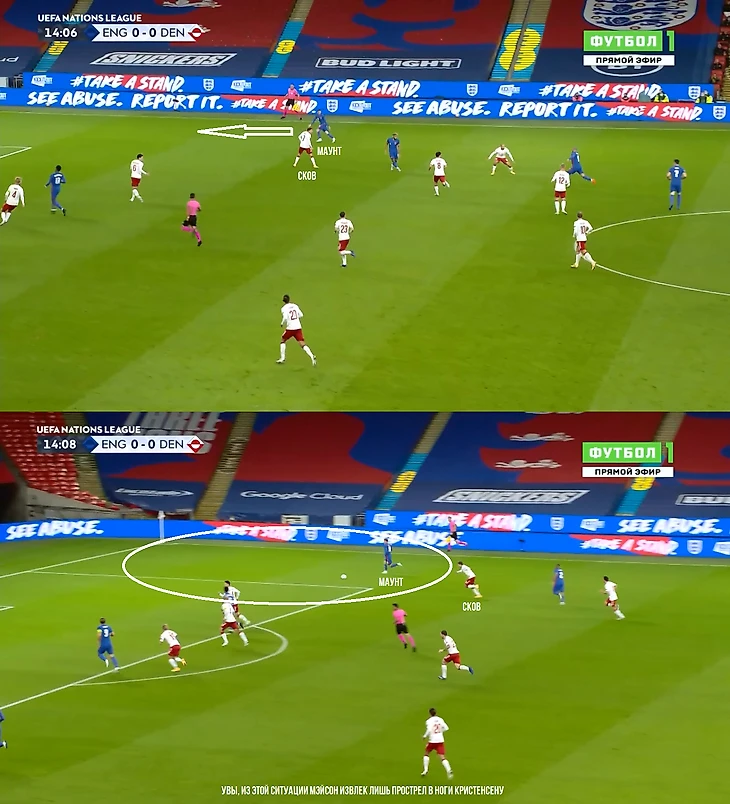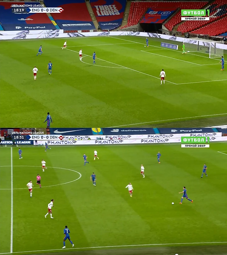 Датчане намеренно играли вторым номером, но их футбол был… поострее. Эффективней. И в то же время не рискованным. Привычной карусели первые полчаса не было, а было вот что. Как и в первой встрече, атакующие игроки датчан поджимали прессингом Пикфорда с защитой при розыгрыше от ворот, однако в этот раз не так уж и жались назад при дальнейшем продвижении полевых англичан. Это решение было скорее в минус, так как к прессингу подключались центральные хавбеки, оставлявшие важные зоны (например, не могли сразу вернуться помочь тому же Скову), что позволяло хозяевам больше времени разыгрывать мяч в позиционной атаке и не давать упираться им в те смешные диагонали направо, что были на «Паркене». Скорей всего, Юлманд счел, что повторится ситуация первой игры, когда Райс и Филлипс были абсолютно никакущими в розыгрыше мяча… Но в этот раз был Маунт, так что смелость датчан была… не опрометчивой, но иногда рискованной.