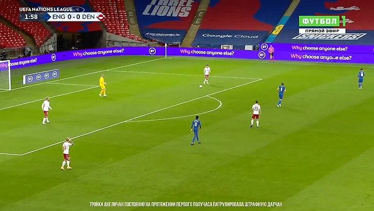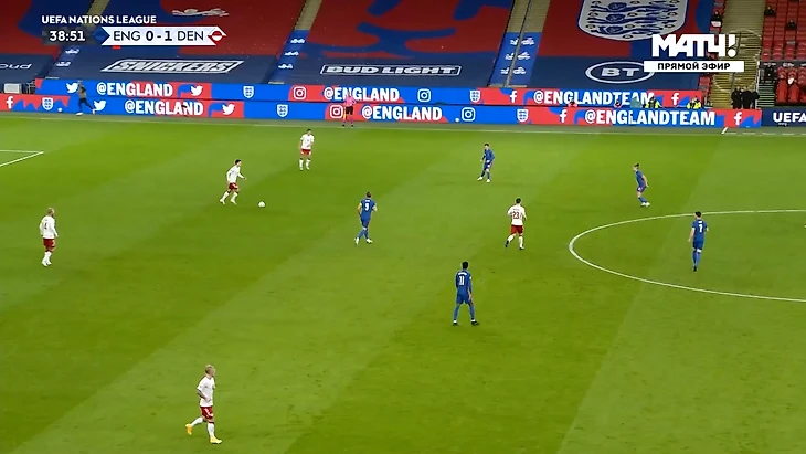 Но англичане не перестали прессинговать на чужой половине. Впятером, да. Очень смелое решение, однако. Полезное – датчане долго выходят из-под него, так как в таком случае единственным решением становятся вновь диагонали, которые до конца тайма, к слову, не используют. Катают мяч для того, чтобы выйти через короткий пас во фланги.