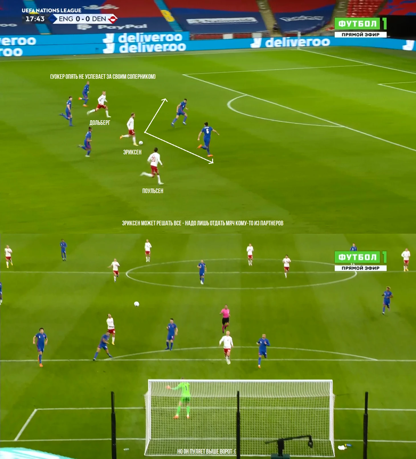 Иногда Дания пробовала и в быстрый выход. Дания не умеет в контратаки, они обучены комфортно владеть мячом большим числом, так что игроки при стремительных атаках принимают неоднозначные решения – начиная от элементарного перехода малым количеством и до финального решения. И даже Кристиан Эриксен, да.