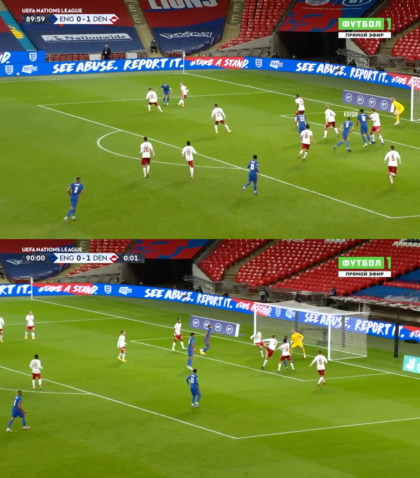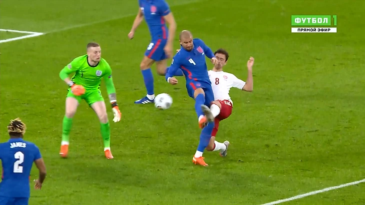 А в конце еще и Пикфорд откровенно плохим ударом не навесил со своей половины поля в штрафную. Тоже ведь косяк. Матч заканчивается владением датчан. А нет, не им.
