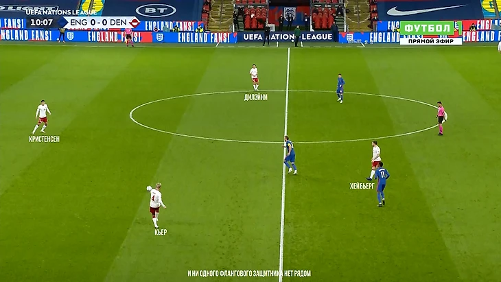 Однако стоит признать, что датчане вновь использовали тактику, которая с успехом использовалась против исландцев. Разумеется, основным способом выхода из обороны были диагонали – чаще направо. И Юлманд вновь использовал фланговых защитников в роли латералей, так как Сков и Васс активно бегали вперед (защитник «Валенсии» даже чаще – и выше, едва ли не полузащитником). А чтобы была подстраховка на случай потери и ситуации 3 в 3, то к центрдефам опускались по очереди хавбеки Дилэйни и Хейбьерг. В какой-то мере это было еще выманивание соперника на прессинг, чтобы сделать затем диагональ, но англичане, к слову, не так уж на это реагировали – еще бы, 7 игроков в поле оборонительного плана.