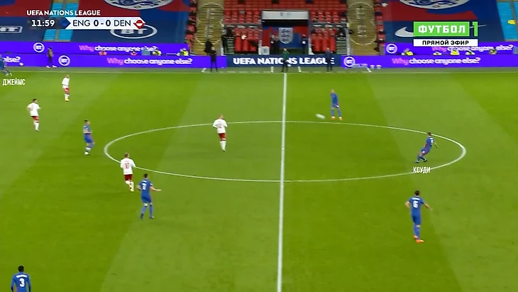 Таких ситуаций было несколько. Комбинации в мелкий пас с дальнейшим выходом в свободную зону Маунта или Джеймса и попыткой прострелить в центр. Левый фланг датчан откровенно провисал, на нем тусили англичане больше всего.
