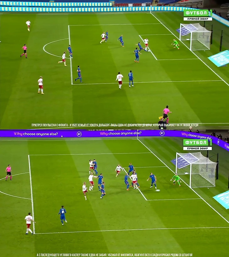 Дания также пробовала в течение игры забросы и по центру, не только на фланг. Думается, это из-за попыток англичан делать искусственный офсайд, так как Дольберга они что в Копенгагене, что в Лондоне старались оставлять вне игры. И эта тактика, до этого практически не использовавшаяся в прошлых матчах, сработала.