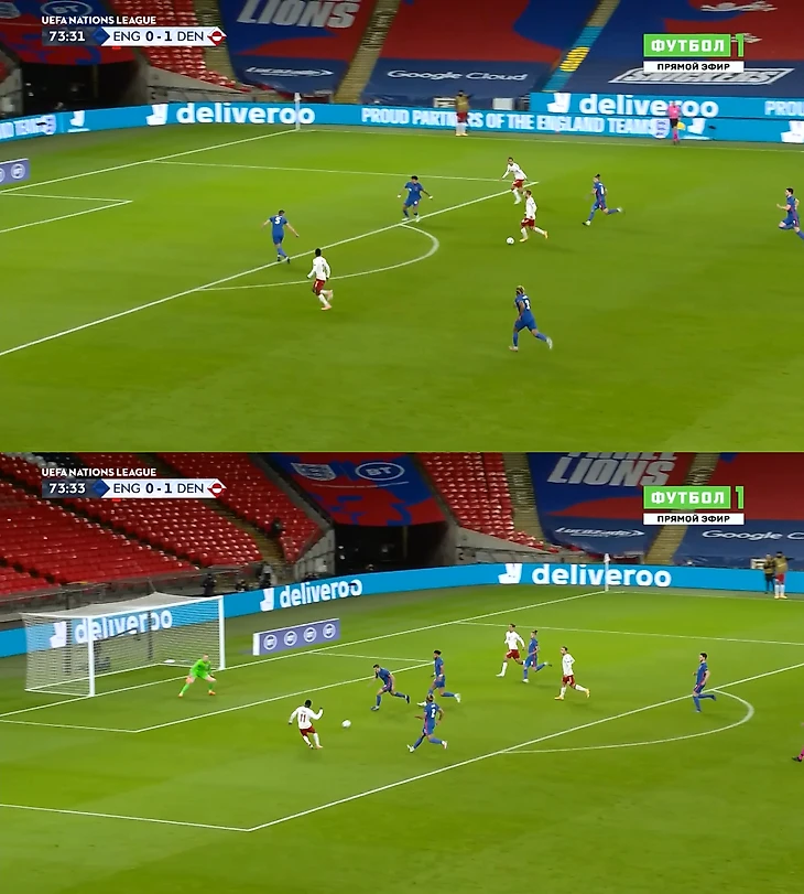 Контратака датчан 2 в 3 – Эриксен отбирает, вкладывает уже идеальную передачу на Систо, но у того мяч на ногу не ложится. Контратаки датчан…