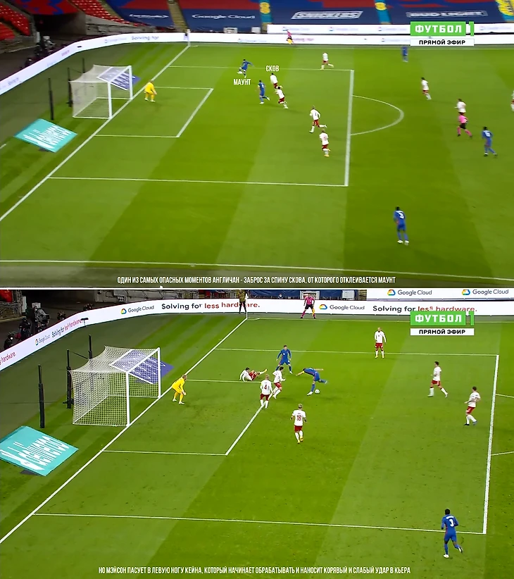 Первые полчаса – это постоянное давление англичан. Они доминировали не только в позиционной атаке, но даже при выносах Шмейхеля от ворот, когда трое форвардов вынуждали датского кипера играть от ворот средними передачами во фланг. Эта история была же и в первом матче, и тогда Каспер сделал немало пасов в никуда. В этот раз таких явных ошибок заметно не было, но сам факт уже имеет значение, так как датчане долго решали, как начинать свое владение.