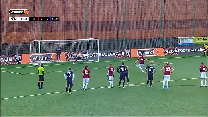 15-я минута. Ладо мощно бьет по воротам из-за штрафной, но один из игроков «Матч ТВ» выставляет локоть и судья назначает пенальти. К мячу подходит Текила, катит влево, а вратарь падает вправо – 3:0