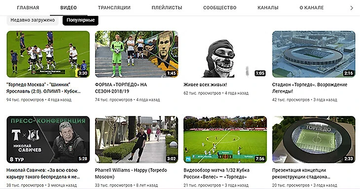 На данный момент просмотры основного канала «Торпедо» не очень высокие. Самое просматриваемое видео на юутб-канале первой команды – пресс-конференция главного тренера команды Андрея Талалаева после матча со «Спартаком» (5,3 тыс просмотров).