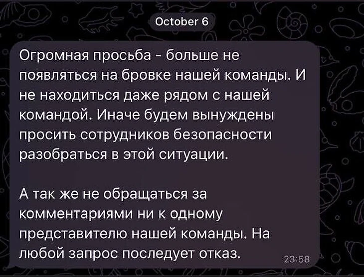 В тот же день руководитель коммуникаций ФК «10» Андрей Клинников написал Милицкому: «Огромная просьба – больше не появляться на бровке нашей команды. И не находиться даже рядом с нашей командой. Иначе будем вынуждены попросить сотрудников безопасности разобраться с ситуацией». Скриншот переписки Юрий выложил в своем телеграме.