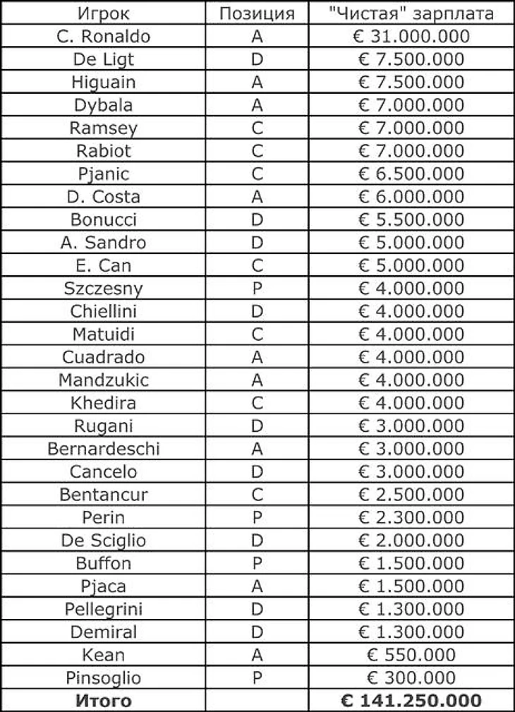 Зарплата «Ювентуса» 2019-2020, картина на сегодняшний день
