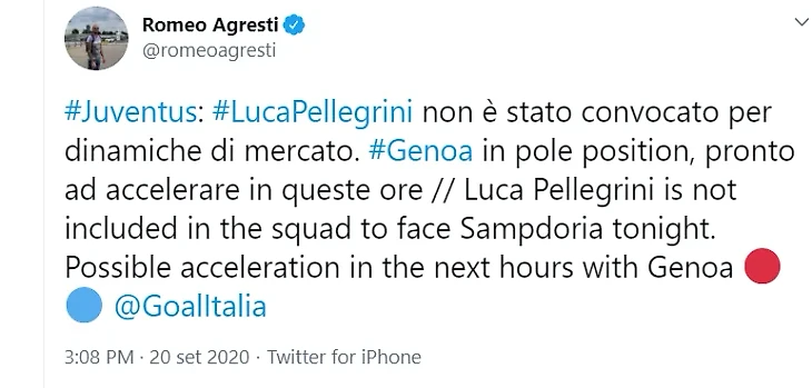 Как сообщает Ромео Арести — надежный источник во всем, что касается итальянского футбола — Лука Пеллегрини не вошел в заявку на матч с «Сампдорией» по рыночным причинам.