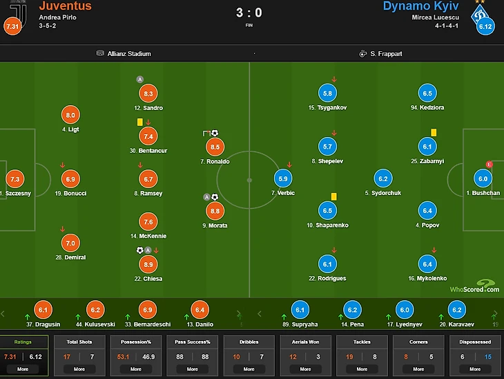 Лучшим, по версии WhoScored стал Кьеза, который и получил самую высокую оценку.