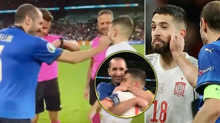Затем Кьеллини обнимает Жорди: «Без обид, но бросок указал на нашу сторону, но, ха-ха, это хорошая попытка!»
