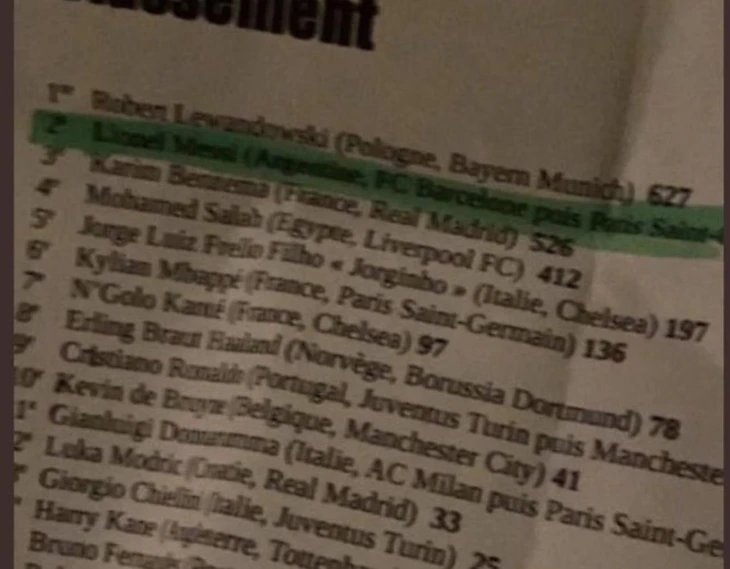 Если данное изображение — не фейк, то обладателем награды станет Роберт Левандовски. Криштиану Роналду, который провел прошлый сезон в «Юве», будет девятым, а Джорджо Кьеллини — 13-м.