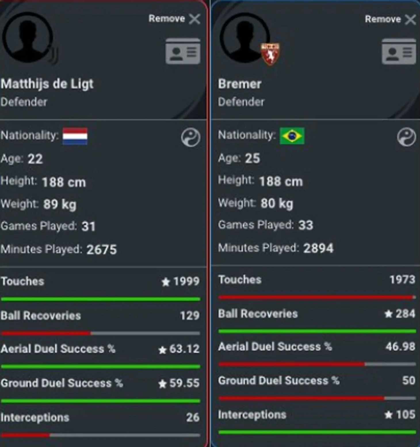 Бремер уступает по игре головой, если смотреть на процент выигранных дуэлей в воздухе, то лидер снова Де Лигт: 63,12% против 46,98%.