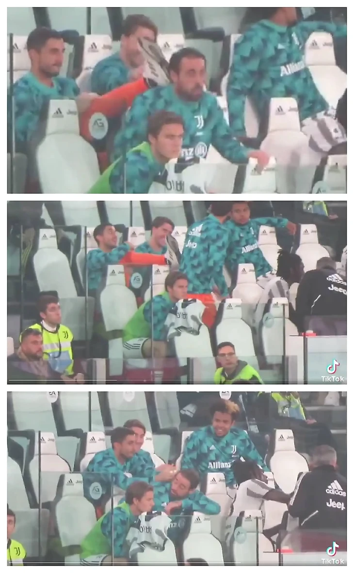 Игроки «Ювентуса» не ушли в себя, а продолжают шутить друг над другом. Маттиа Перин и Душан Влахович, которого на тот момент заменили, решили подшутить над третьим вратарем бьянконери Карло Пинсольо. Перин закинул ногу на сидение Пинсольо, а затем скинул все на Влаховича.