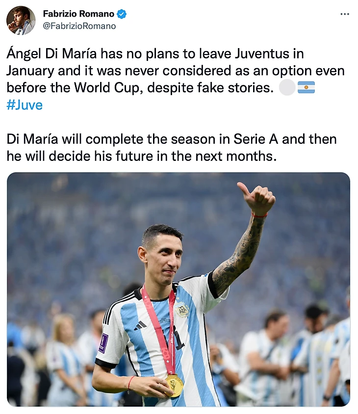 «Анхель Ди Мария не планирует покидать «Ювентус» в январе. Более того, он никогда и не рассматривал такой вариант вообще, даже до чемпионата мира. Это были фальшивые истории.