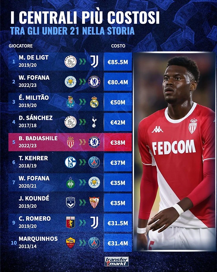 Немецкий трансферный портал Transfermarkt составил десятку самых дорогих трансферов центральных защитников до 21 года. Первое место предсказуемо занял Маттейс де Лигт, чей трансфер из «Аякса» в «Ювентус» был оценен в 85,5 млн евро.