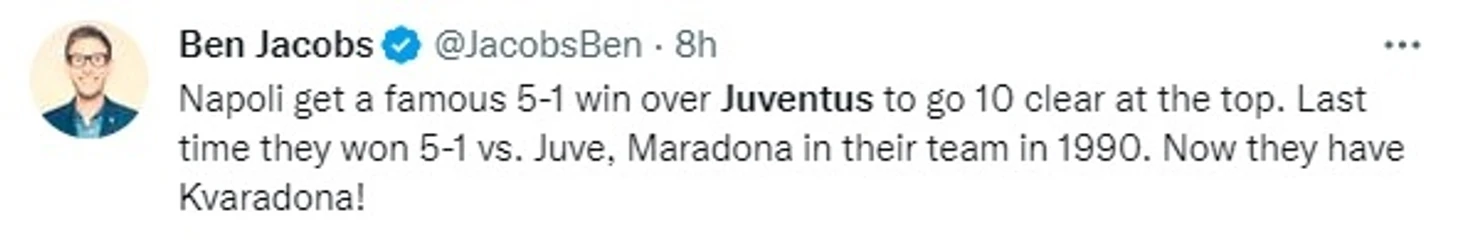 «Наполи» обыгрывает «Ювентус» 5:1 и лидирует в Серии А с преимуществом в 10 очков. Последний раз они обыгрывали «Юве» 5:1 в 1990 г., когда у них в команде был Марадона. А теперь у них есть Кварадона!».