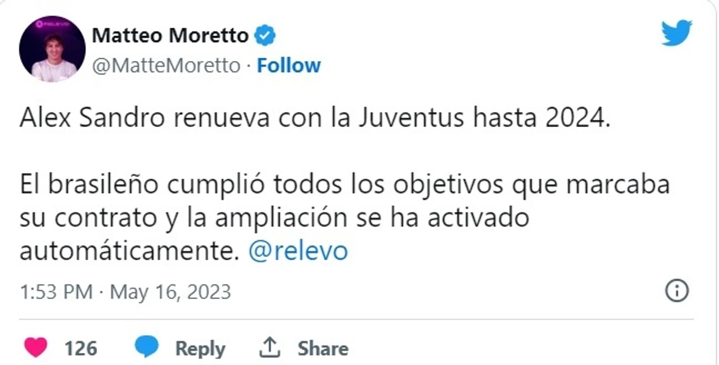 По информации журналиста Маттео Моретто из Relevo, Алекс Сандро продлил соглашение с «Ювентусом» до 2024 года.