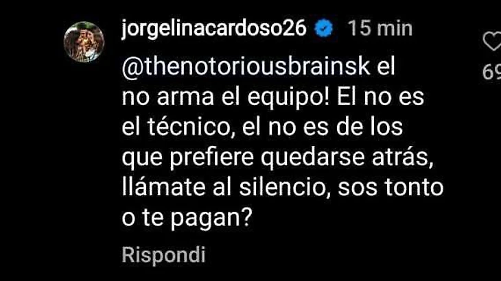 Хорхелина Кардосо, жена Анхеля Ди Марии, увидела в одной из социальных сетей комментарий, который критиковал ее мужа, и решила ответить. Получилось, мягко говоря, не очень.