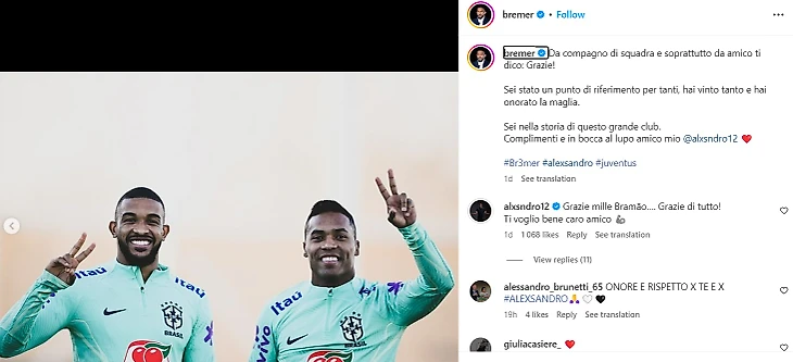 Одноклубники посвятили посты в социальных сетях покидающему «Ювентус» Сандро.