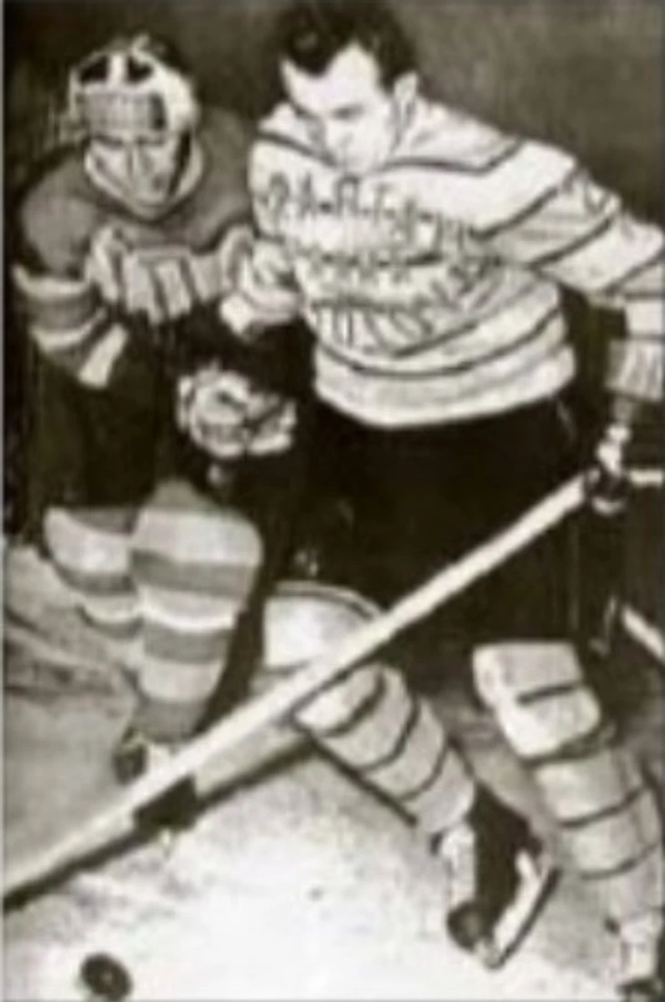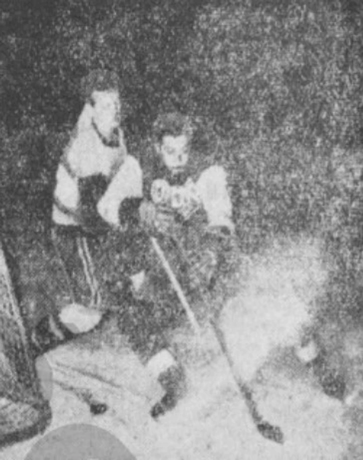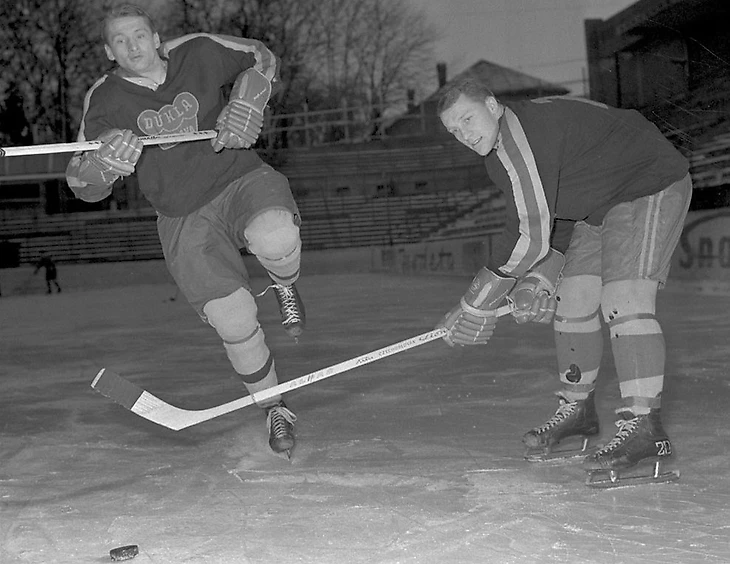 1953/54. УДА (Прага) - «Спартак Соколово» (Прага). В борьбе за шайбу сошлись центрфорвард армейцев Кароль Фако и защитник спартанцев Карел Гут
