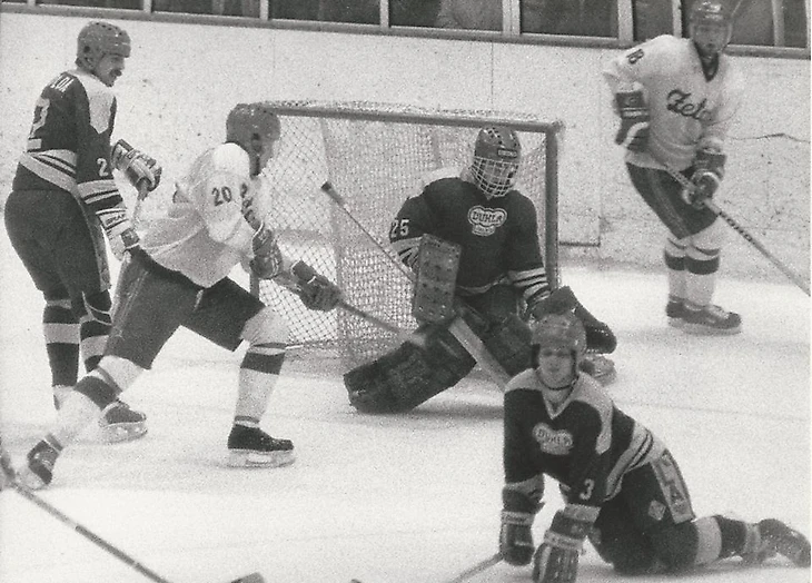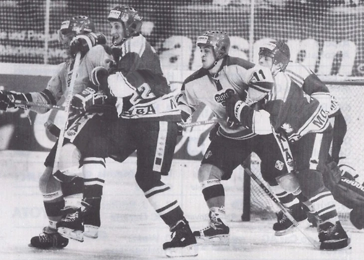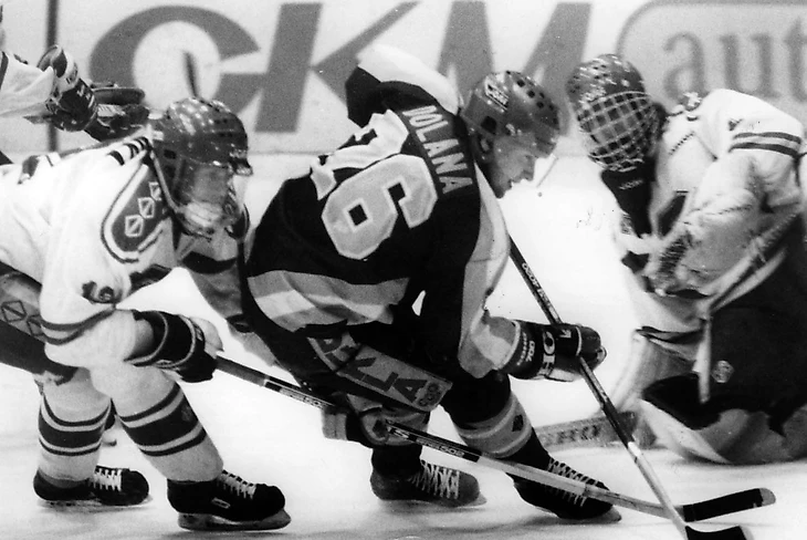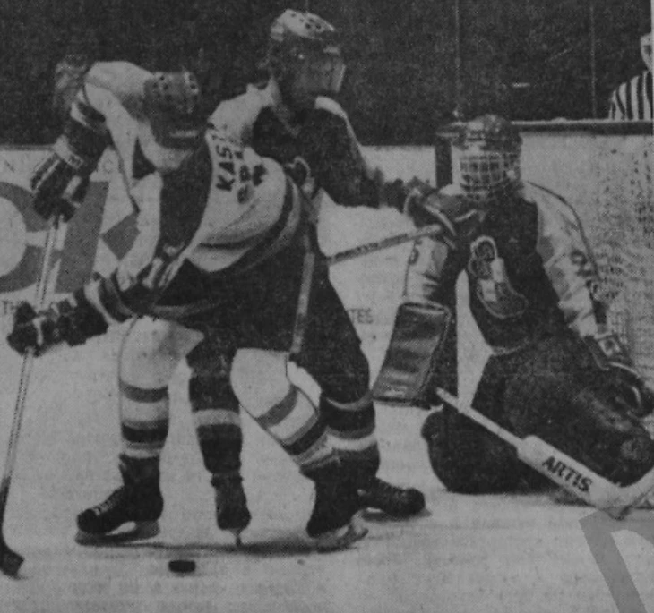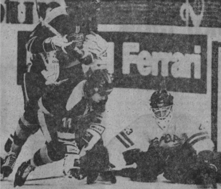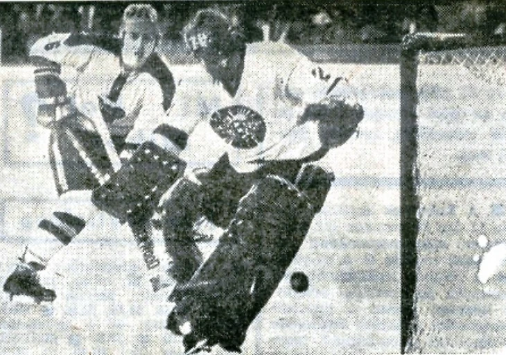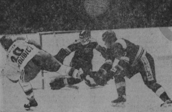 6 марта 1987 года. Йиглава. Второй матч финальной серии за звание чемпиона ЧССР. «Дукла» (Йиглава) - «Тесла» (Пардубице) - 6:1. Опасный момент у ворот Доминика Гашека