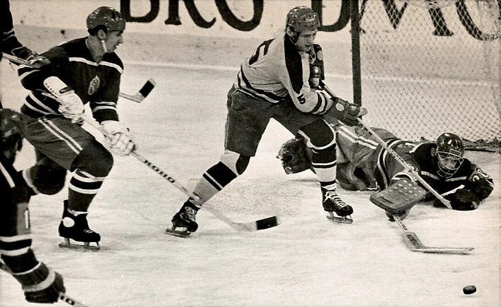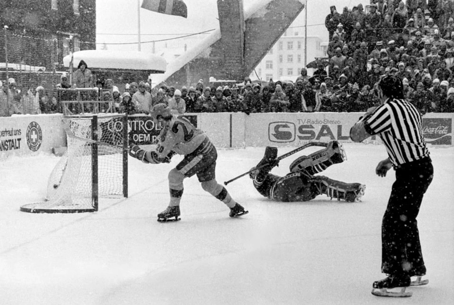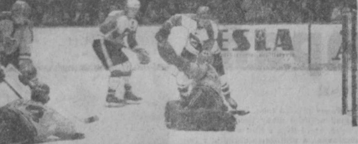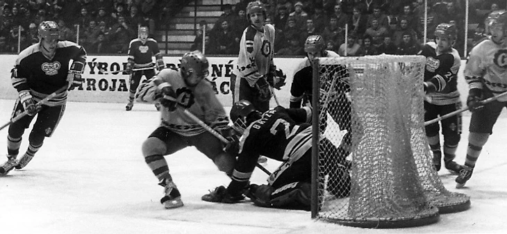 31 декабря 1970 года. Давос. Кубок Шпенглера. СКА (Ленинград) - «Дукла» (Йиглава) - 3:1. Сергей Солодухин пытается добить шайбу в ворота, защищаемые Иржи Црхой