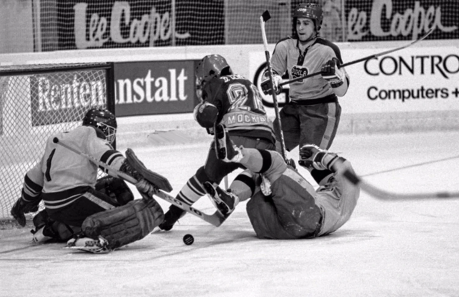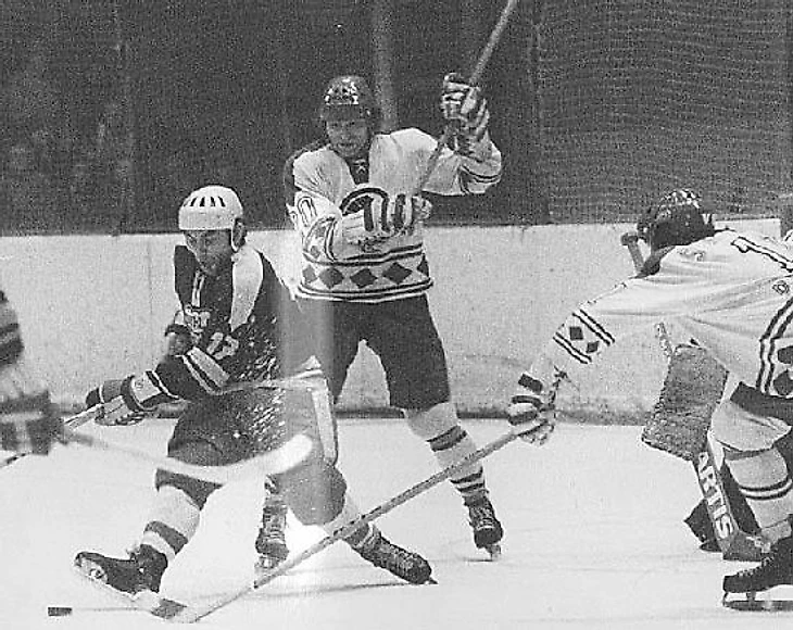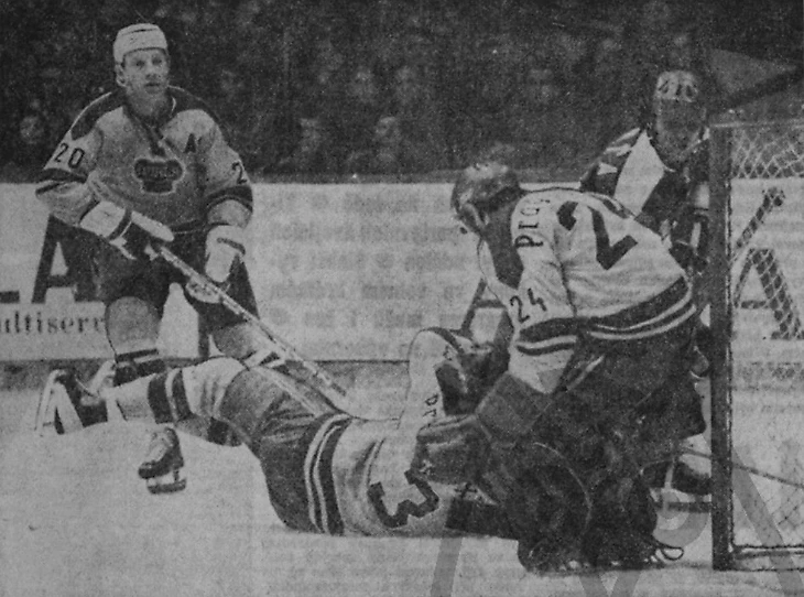 27 декабря 1983 года. Давос. Кубок Шпенглера. «Дукла» (Йиглава) - «Швеннинген» (Швеннинген) - 3:1. Ворота Маттиаса Хоппе атакуют Милош Купец и Олдржих Валек