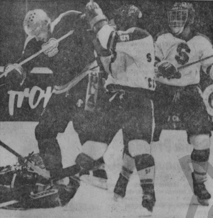 30 декабря 1983 года. Давос. Кубок Шпенглера. «Динамо» (Москва) - «Дукла» (Йиглава) - 4:0. Вратарь Иржи Стеглик и пара защитников Камил Прачарж и Карел Хорачек (на льду) против динамовца Анатолия Семенова
