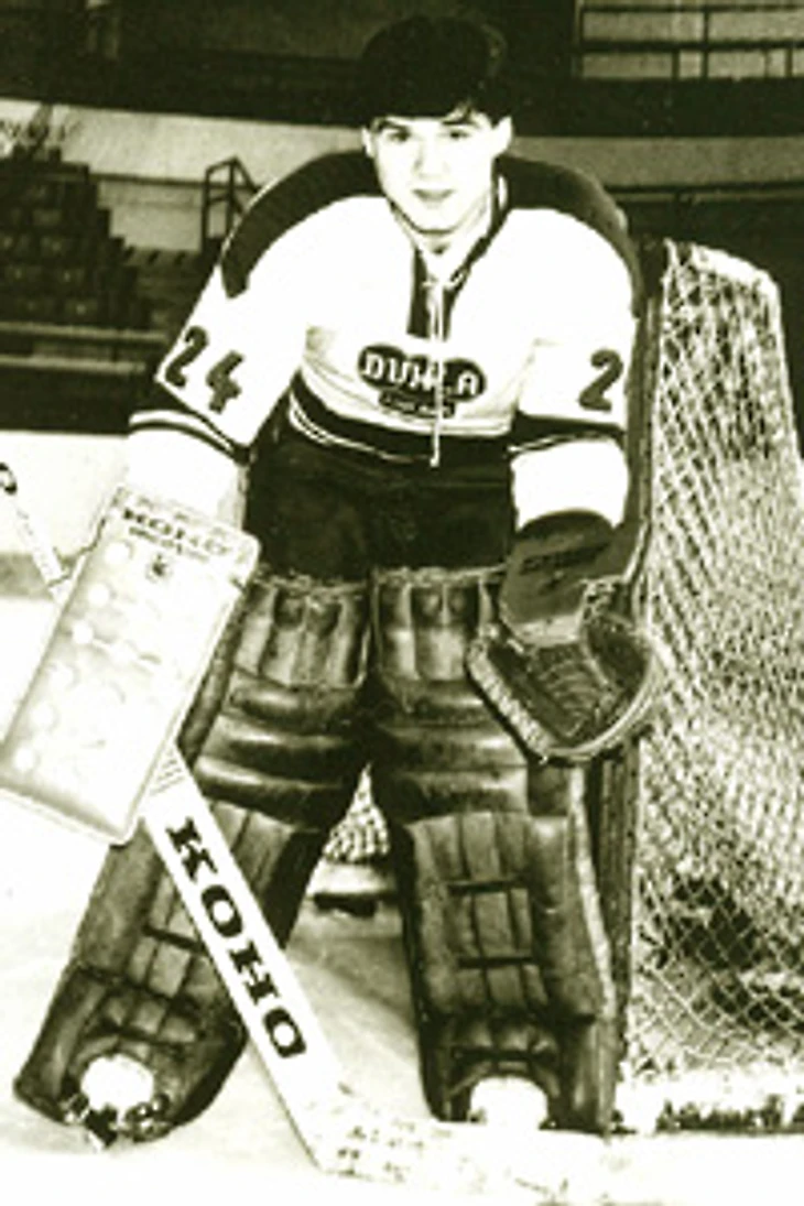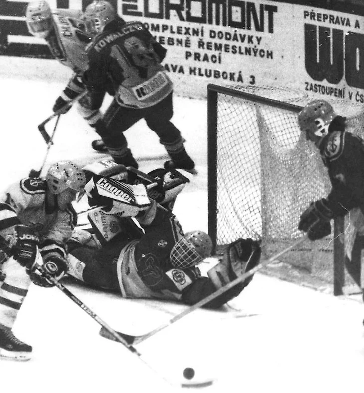 1989/90. Вратарь йиглавской «Дуклы» Доминик Гашек прижимает шайбу ко льду во встрече с тренчинскими одноклубниками