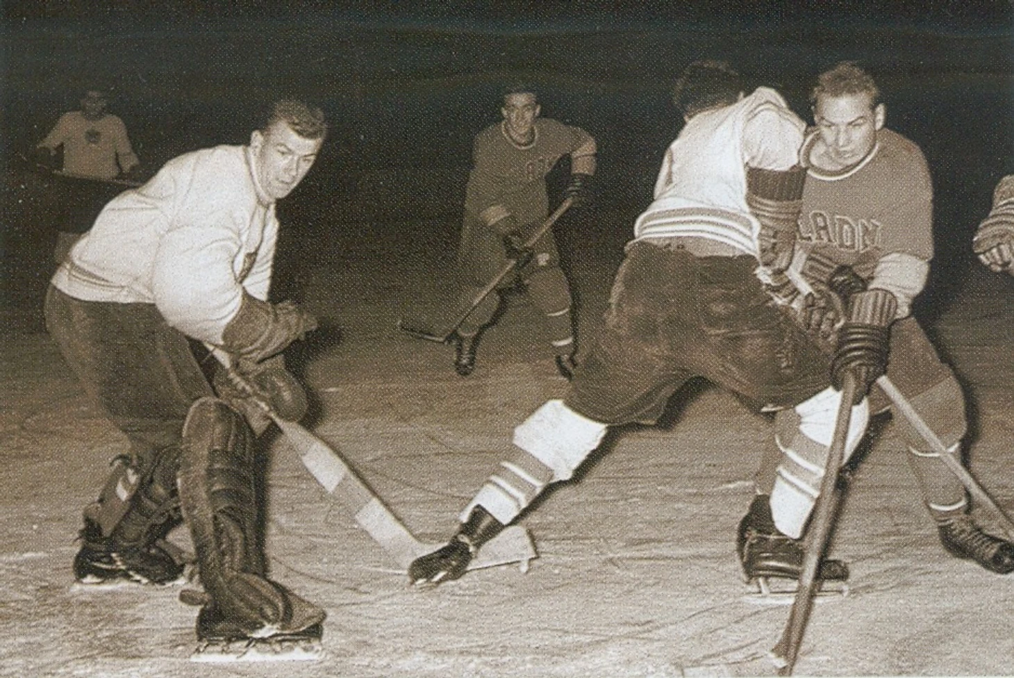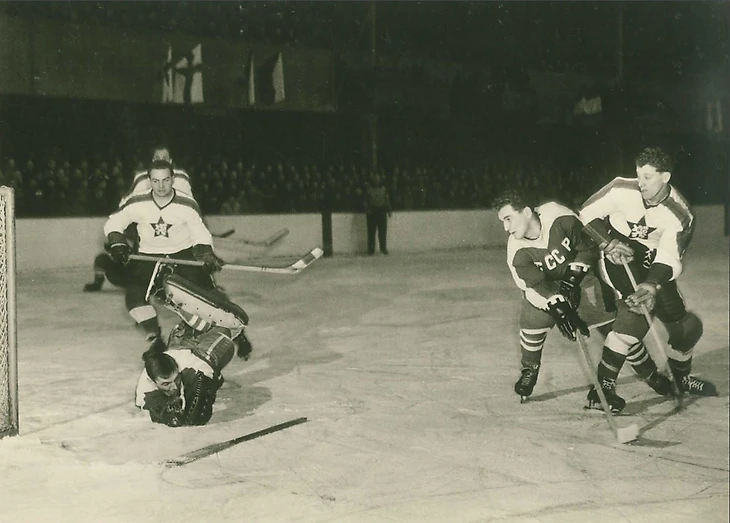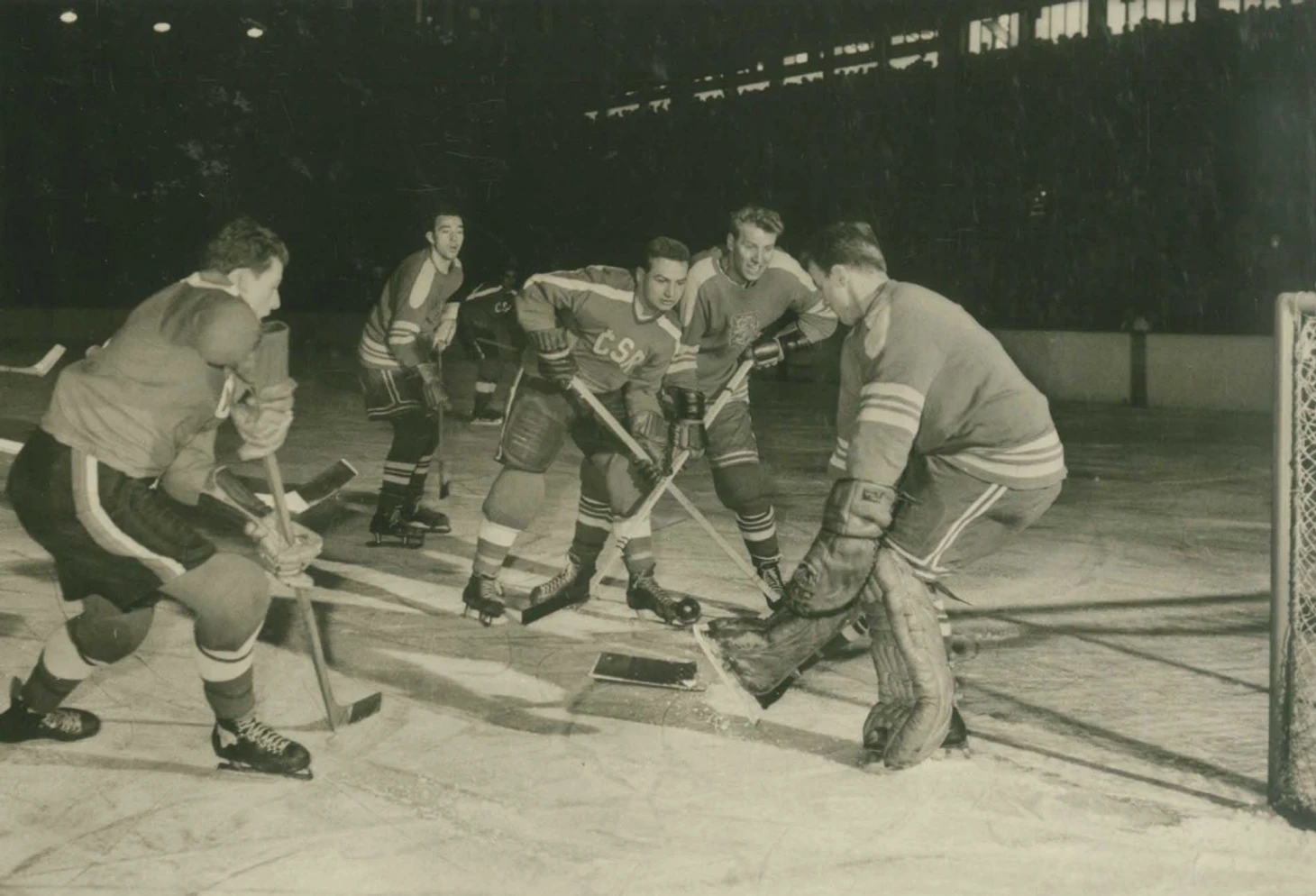 12 марта 1959 года. Прага. Чемпионат мира. СССР - Чехословакия - 4:3. Ярослав Иржик на пятачке сборной СССР караулит отскок после броска Йозефа Голонки (за спиной Иржика - Ярослав Вольф)